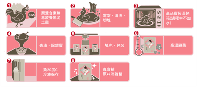 真食補的滴雞精是使用契養於台東放養的黑羽土雞(蛋前雞),電宰清洗切塊後,以蒸烤方式滴製15個小時,過程中不添加一滴水,調味料及防腐劑,所以必須要冷凍保存。滴雞精在冷藏狀態下除去油脂,保留滿滿的雞肉精華與膠質。