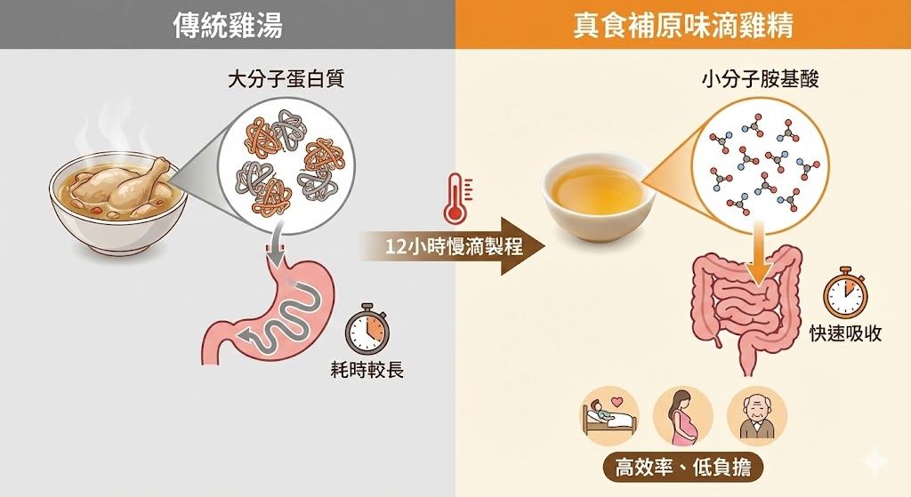滴雞精、鱸魚精與鱘龍魚精等產品的核心價值,在於其製程工藝實質上是一種「體外預消化(Pre-digestion)」的過程。