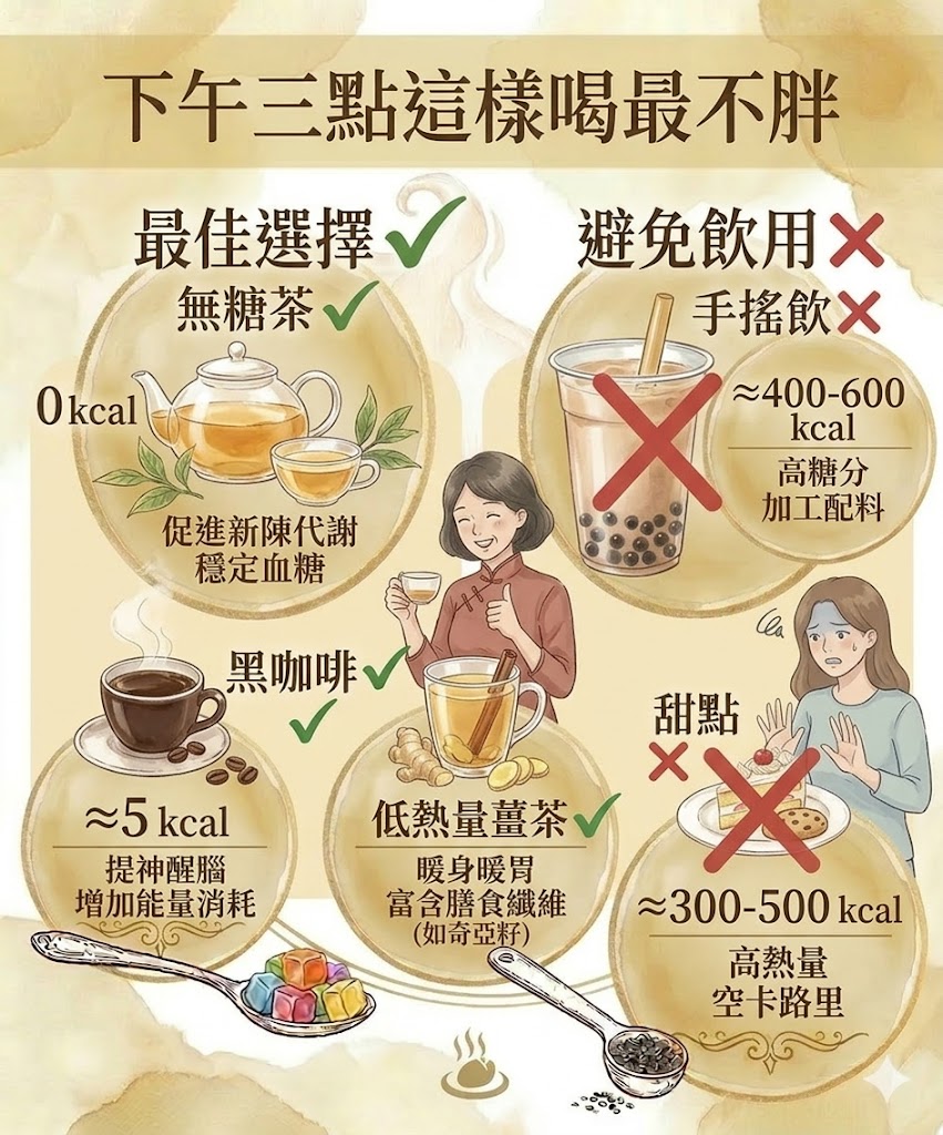 建議選擇無糖茶、黑咖啡或低熱量飲品。