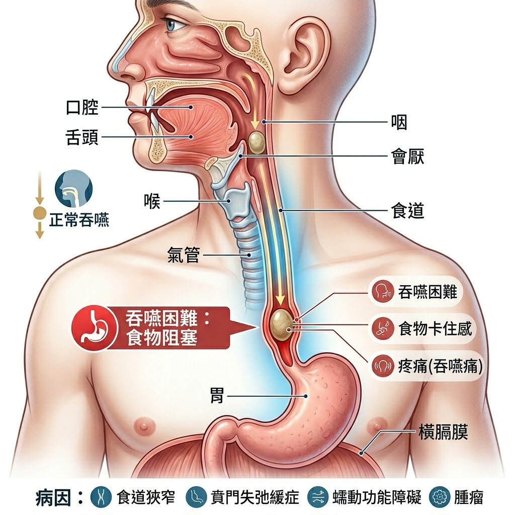 吞嚥困難 是指食物從口腔到胃的過程中出現障礙。
