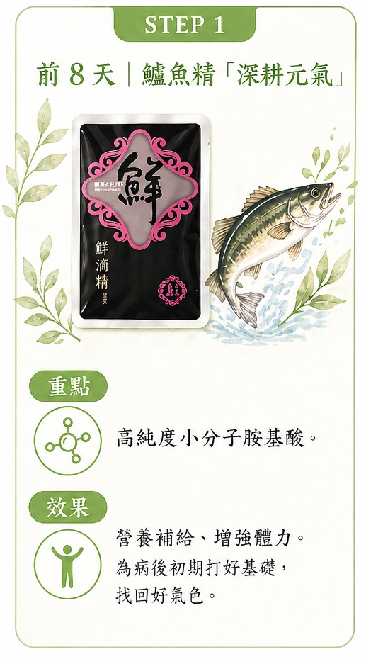 Step 1:前 8 天|鱸魚精「深耕元氣」,打好修復基礎