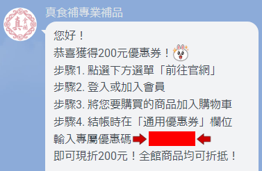 加好友後輸入關鍵字「官網」即可獲得200元優惠券代碼