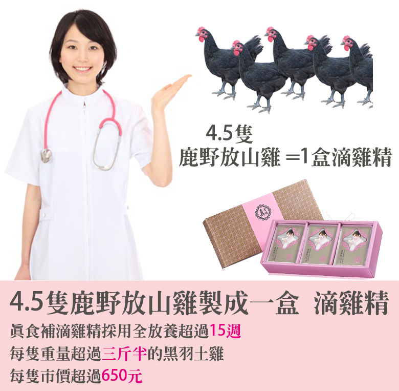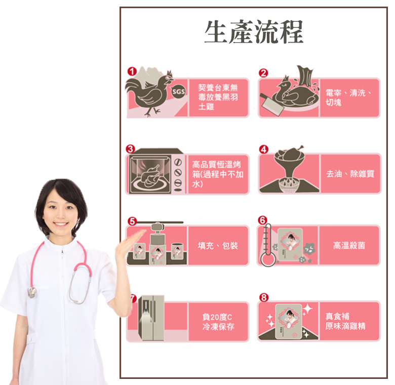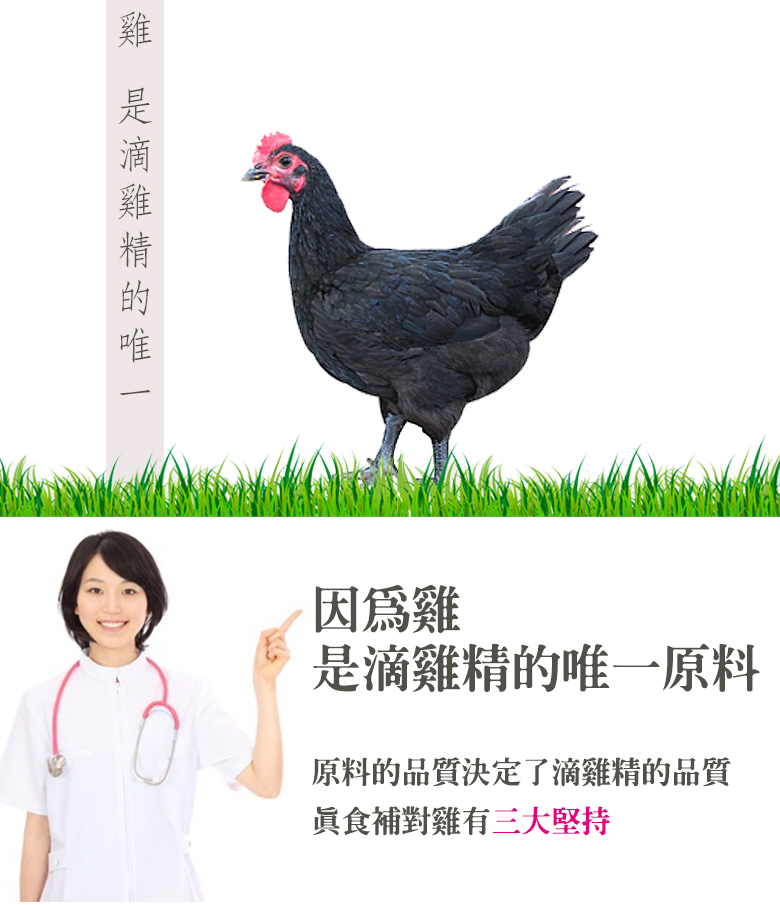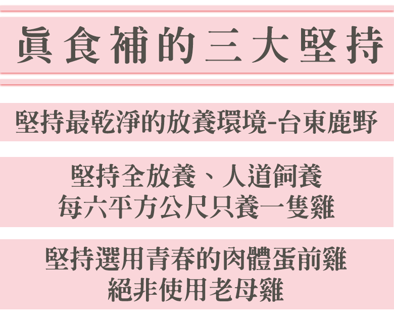 堅持使用「生蛋前的台東鹿野”全放山”黑羽土雞」,絕不使用老母雞或籠養雞,即使成本比業界高一倍以上,我們仍堅信唯有使用最好的原料,才能滴出營養價值最高的真食補滴雞精!真食補長期深耕醫院通路,深獲各界肯定,真食補所有產品均經SGS檢驗,無抗生素或其它藥物殘留,請放心選購。