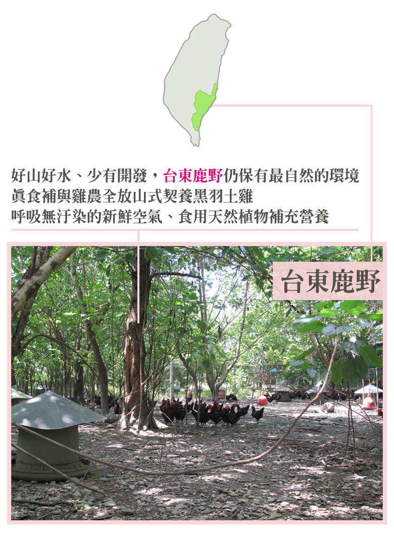 台東鹿野,與雞農全放山式契養我們所要製作滴雞精的黑羽土雞,這裡所飼養的雞,喝的是從中央山脈留下來的山泉水,呼吸的是無污染的新鮮空氣,除了吃一般飼料之外,還有天然的植物(鹿仔樹、牧草)可以讓牠們補充營養,因為這樣優良的環境,真食補才能保證滴雞精的品質!