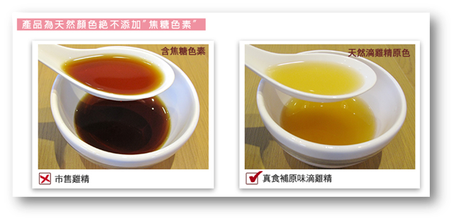 為了讓每瓶雞精的顏色一致,市售雞精會加入焦糖色素調色,所以顏色呈現深褐色;因氣候改變,一年四季的雞所做出來的滴雞精顏色會略有不同,但真食補堅持絕不加任何添加物,保留雞精最原始的顏色。