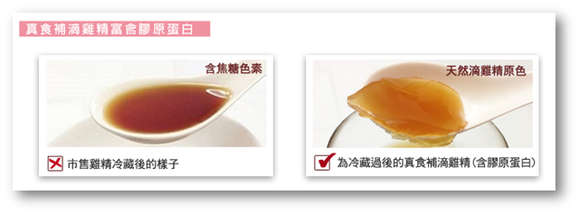 左圖為市售雞精冷藏後的樣子,雖已冷藏一段時間,但由於所含的蛋白質不足,無法結成凍狀;而右圖為冷藏過後的真食補滴雞精,因含豐富的蛋白質,在冷藏狀態短時間內即可結成ㄉㄨㄞㄉㄨㄞ果凍狀。