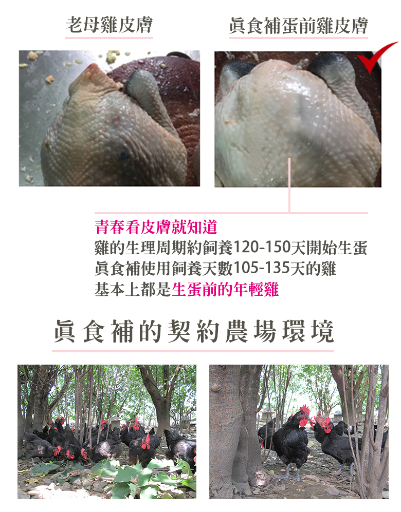 真食補使用飼養天數105-135天的雞,基本上都是生蛋前的年輕雞!青春年華的雞,營養價值最是豐富也最適合拿來製作滴雞精。而所謂的老母雞,其實是已經老到無法產蛋的淘汰雞,其實是已經沒有足夠的營養價值了!