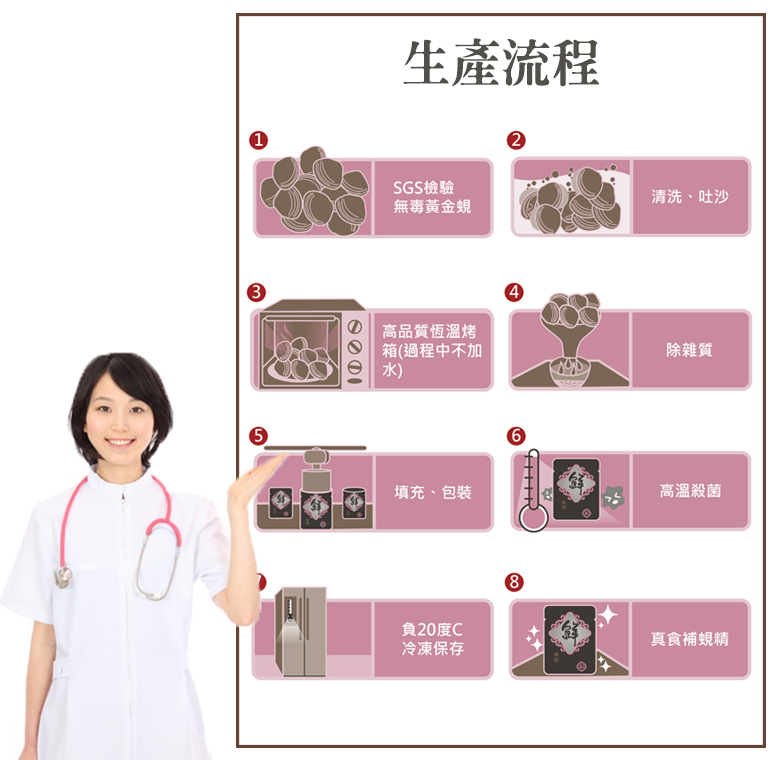 真食補滴蜆精製作過程中,不添加任何一滴水、防腐劑、香料、色素,並利用溫度、時間、濕度和壓力製作而成,完整保留黃金蜆的精華,營養價值高!