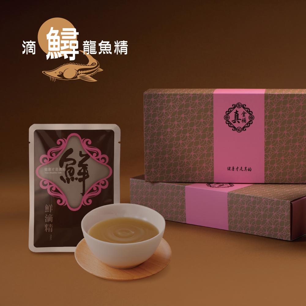 真食補選用位於宜蘭以天然泉水無毒養殖的鱘龍魚,來製作最好的鱘龍魚精,製作過程不加一滴水,經十小時長時間高溫蒸烤萃取出完整的營養精華。