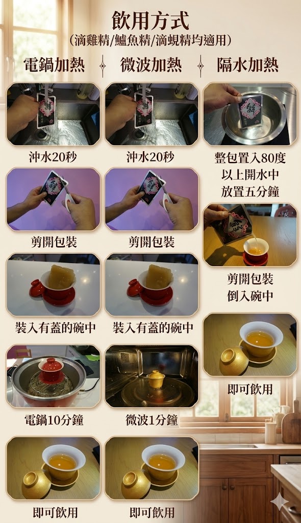 特色:無水滴萃,富含小分子胺基酸。口感香醇無腥味,就像現燉雞湯。