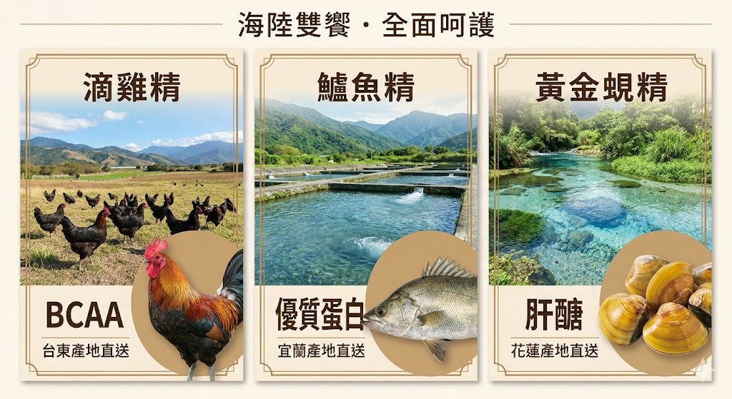 嚴選台東黑羽土雞、宜蘭鱸魚與花蓮黃金蜆,無水滴萃、零添加。