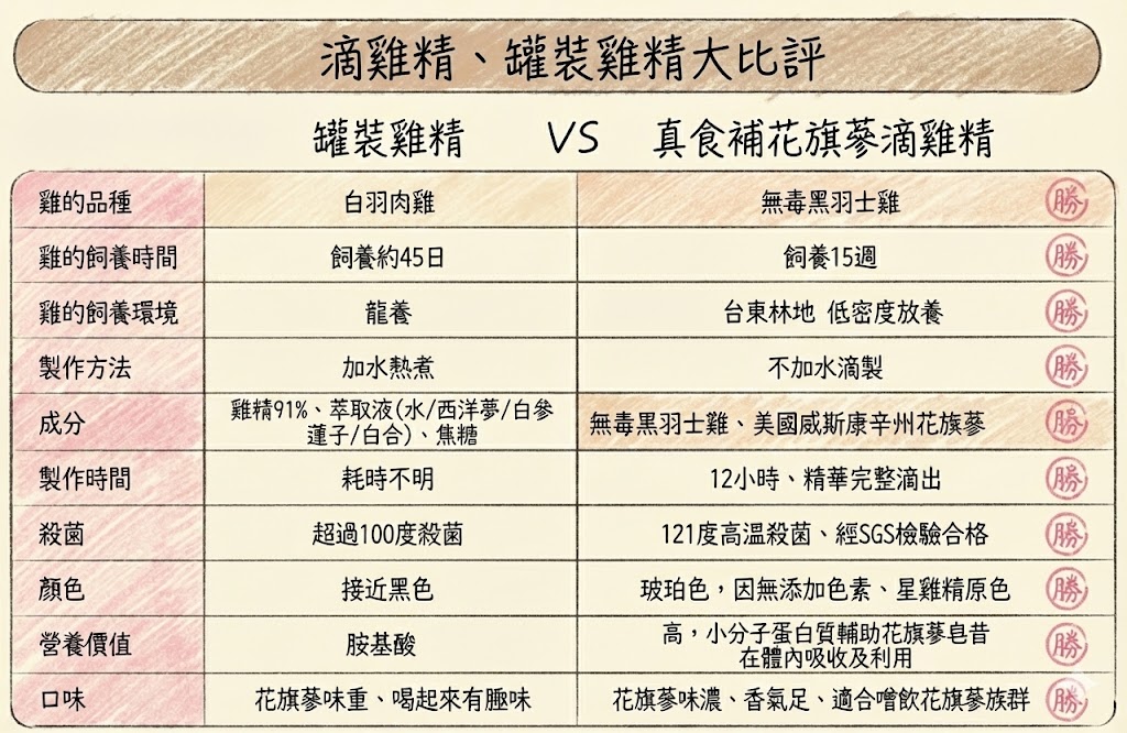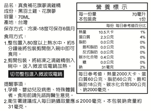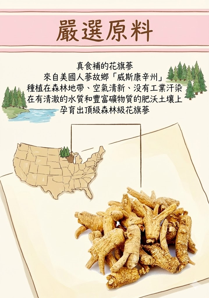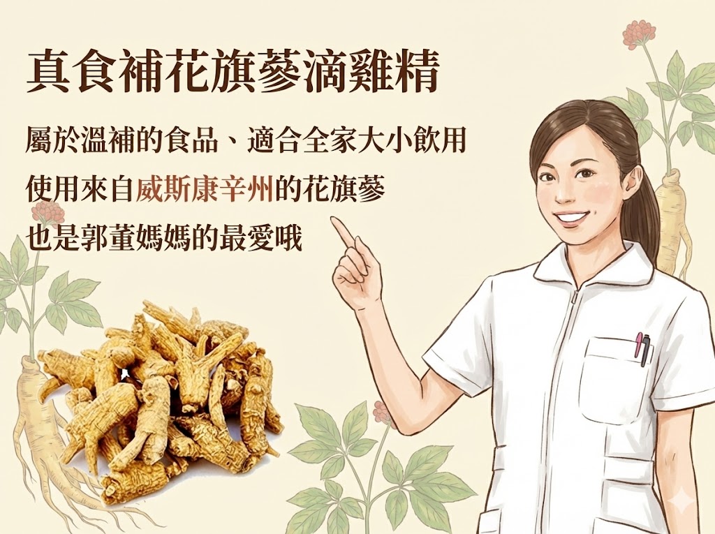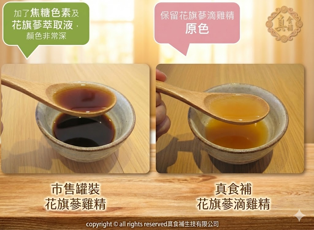 真食補花旗蔘滴雞精真材實料,除了全雞與花旗蔘(使用真正的威士康辛州花旗蔘、非使用萃取液)之外什麼都不添加,不為了省成本而添加一堆看不懂的藥材!