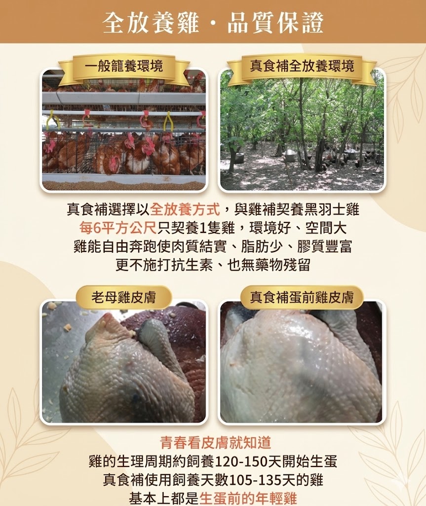 真食補使用飼養天數105-135天的雞,基本上都是生蛋前的年輕雞!青春年華的雞,營養價值最是豐富也最適合拿來製作滴雞精。而所謂的老母雞,其實是已經老到無法產蛋的淘汰雞,其實是已經沒有足夠的營養價值了!