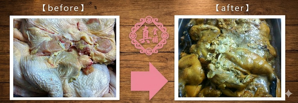 真食補滴雞精所使用的雞肉、經過了12個小時嚴謹的製作過程前後的變化。畫面左邊是雞肉處理好準備進爐製作的樣子,可以看的出來雞肉的新鮮度及含水度。畫面右邊是製作後剩餘的雞肉已呈現乾扁的狀態。在經過了這漫長的製作過程後,基本上雞肉的營養價值幾乎已經都被滴出來了,變成真食補滴雞精。