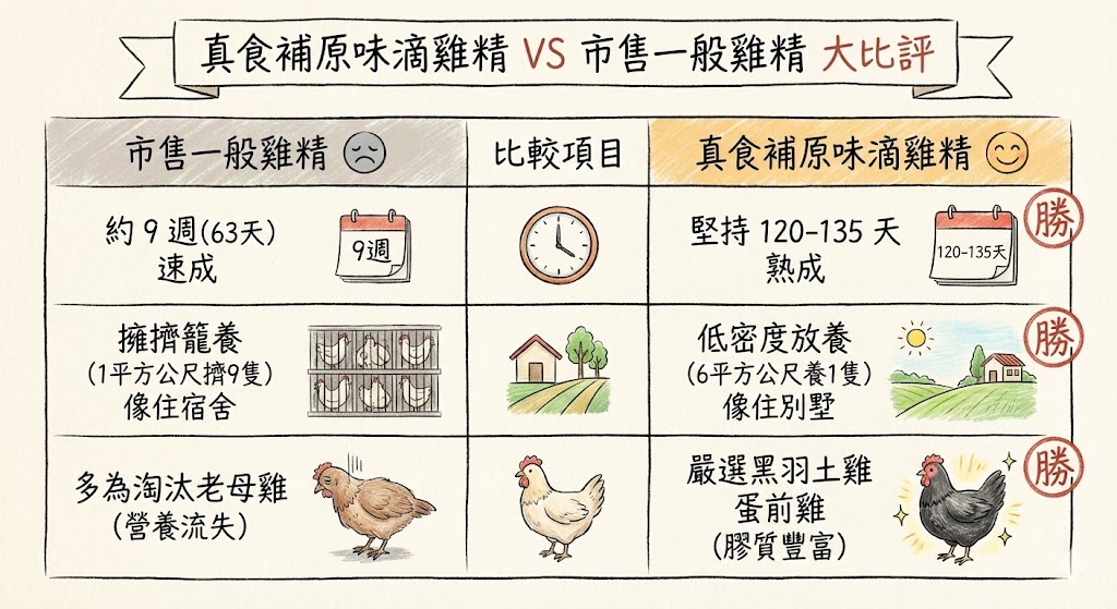 全放山雞要多吃6週的飼料,才能長到和籠養雞一樣的重量,因此全放養的成本比籠養高出許多!真食補為了有更好品質的的滴雞精,堅持使用全放養的台東鹿野黑羽土雞。