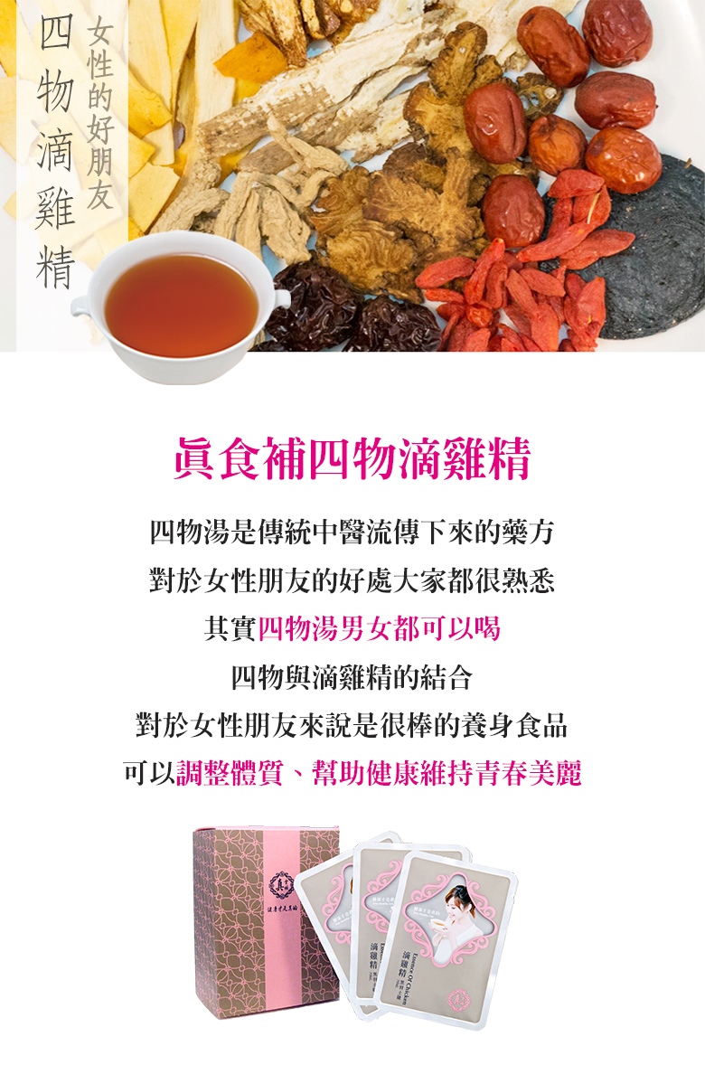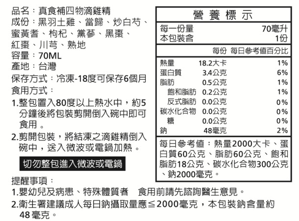 成份:黑羽土雞,當歸,炒白芍,蜜黃耆,枸杞,黨蔘,黑棗,紅棗,川芎,熟地