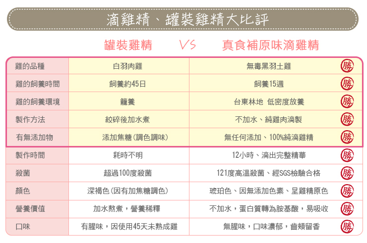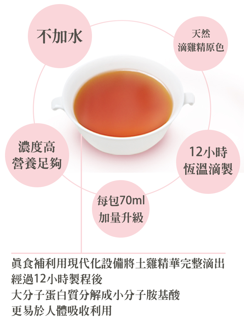 本產品製作過程中無添加任何一滴水、防腐劑、香料、色素或其它成份,僅利用溫度、時間、濕度和壓力,將全雞精華滴製成滴雞精,完整保留優質土雞精華,營養價值高。