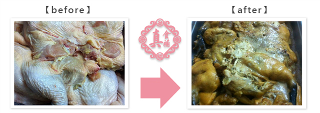 真食補滴雞精所使用的黑羽土雞肉、經過了12個小時嚴謹的製作過程前後的變化。畫面左邊是雞肉處理好準備進爐製作的樣子,可以看的出來雞肉的新鮮度及含水度。畫面右邊是製作後剩餘的雞肉已呈現乾扁的狀態。在經過了這漫長的製作過程後,基本上雞肉的營養價值幾乎已經都被滴出來了,變成真食補滴雞精。
