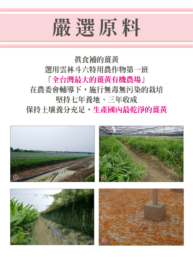 雲林斗六特用農作物第一班, 全台灣最大的薑黃有機農場, 佔地約八公頃(租用台糖地), 在行政院農委會輔導下, 施行無毒無污染的栽培, 堅持七年養地、三年收成,保持土壤養分充足生產國內最乾淨的薑黃。