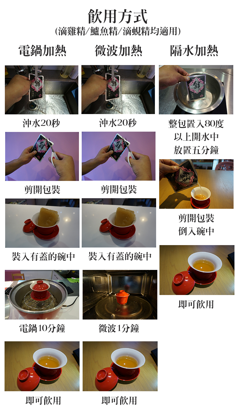 2. 以冷水沖包裝袋約30秒,待結凍之滴雞精冷卻成為液體,剪開包裝,將滴雞精倒入碗中,送入微波爐或電鍋加熱。(切勿整包進入微波爐或電鍋)