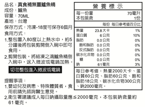 本產品生產製程廠房,其設備或生產管線與其他含有蜆、鱸魚、鱘龍魚的產品於同一生產線生產,食品過敏者請留意。