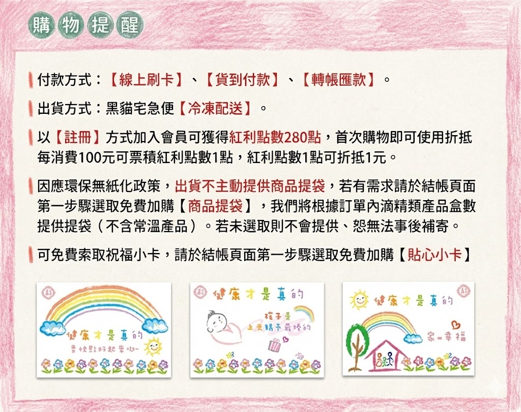 1.因應環保無紙化政策,出貨不主動提供商品提袋,若有需求請於結帳時選取免費加購【商品提袋】