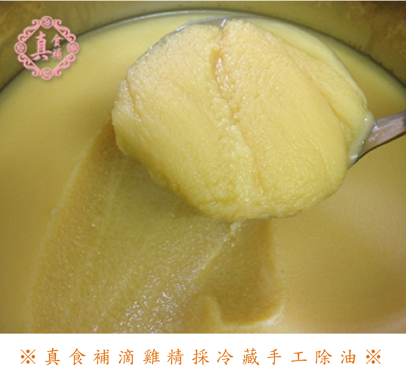 真食補滴雞精利用現代化製程,不加水及任何化學物質,滴出全雞精華,且經過除油殺菌,幾乎零油脂,主要成分為蛋白質,由於雞肉經過長時間處理,有相當比例的蛋白質會分解成分子較小的胺基酸,比大分子的蛋白質更容易被腸道給消化與吸收利用,這對一般健康人的蛋白質消化吸收是沒什麼影響,但對身體虛弱的人可就有差了。