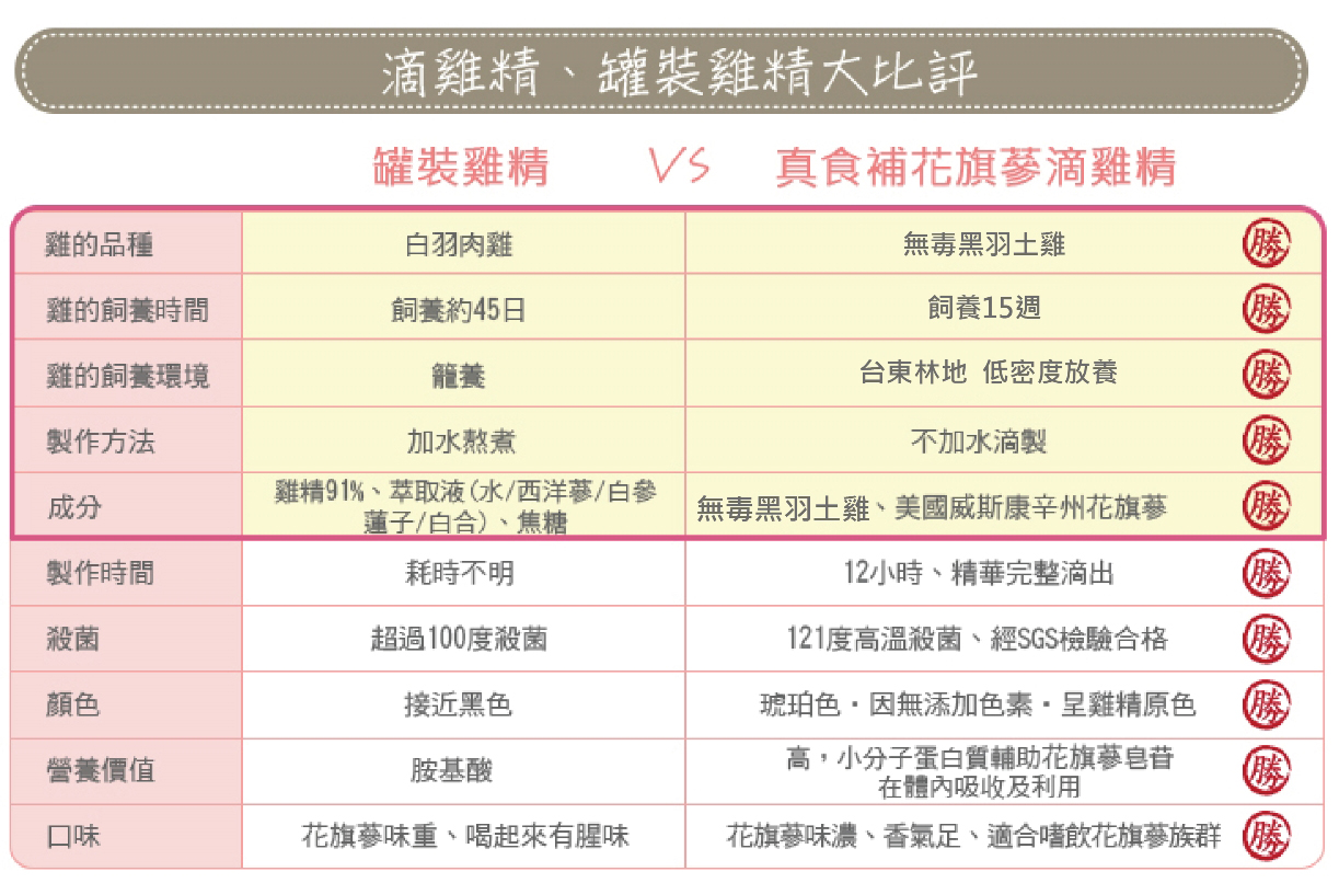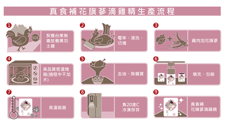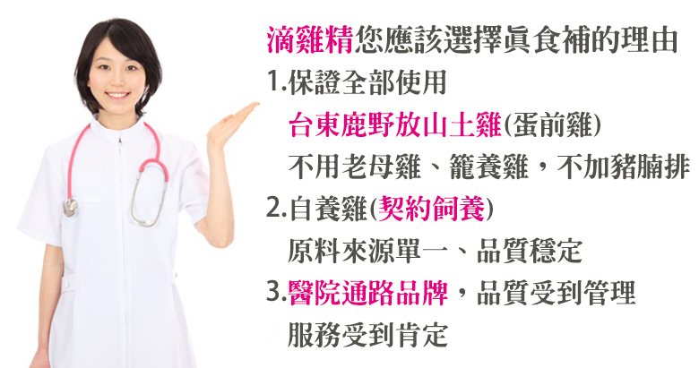 本產品製作過程中無添加任何一滴水、防腐劑、香料、色素或其它成份,僅利用溫度、時間、濕度和壓力,將全雞精華滴製成滴雞精,完整保留優質土雞精華,營養價值高。